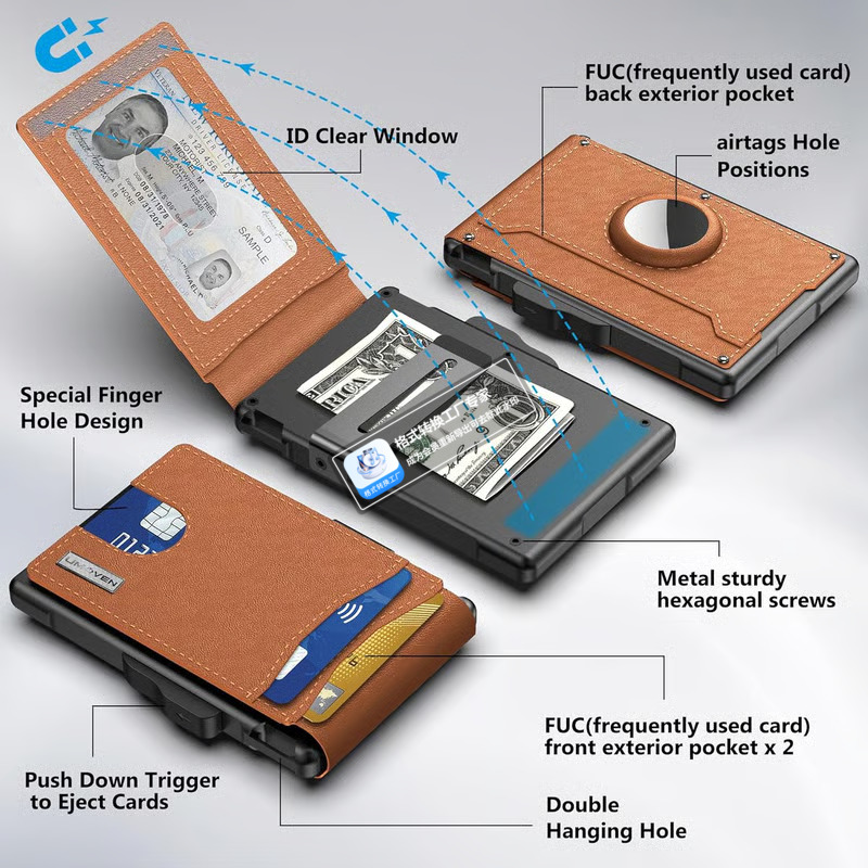 - 【MINIMALIST AIRTAG WALLET 】: We have chosen high quality materials for the wallet cover. Handmade high quality leather + carbon fiber texture.. The aluminum wallet chamber make of premium metal with a smooth eject pop up feature, using the latest ergonomic design, easy slide the side button of the metal wallet and get the neat pop-up cards.